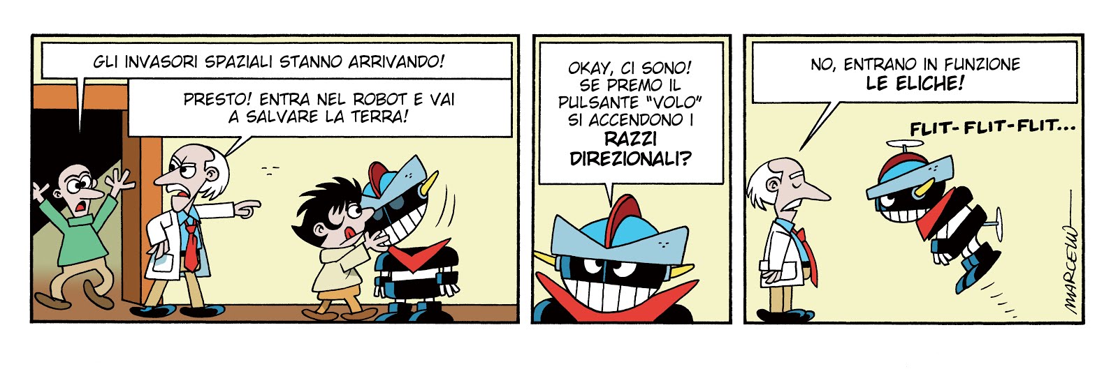A fine marzo, a Padova, si è tenuta la seconda edizione del Be Comics, festival internazionale del fumetto, del gioco e della cultura pop. Tra gli eventi, una mostra dedicata ai "robottoni" organizzata in collaborazione con la fiorentina Accademia Nemo di Casini, Chiarotti e Mariotti. Hanno chiesto anche a me di dare un contributo. A strisce umoristiche, naturalmente. Potete vedere-leggere qui sotto il risultato (in singole strisce e impaginato).